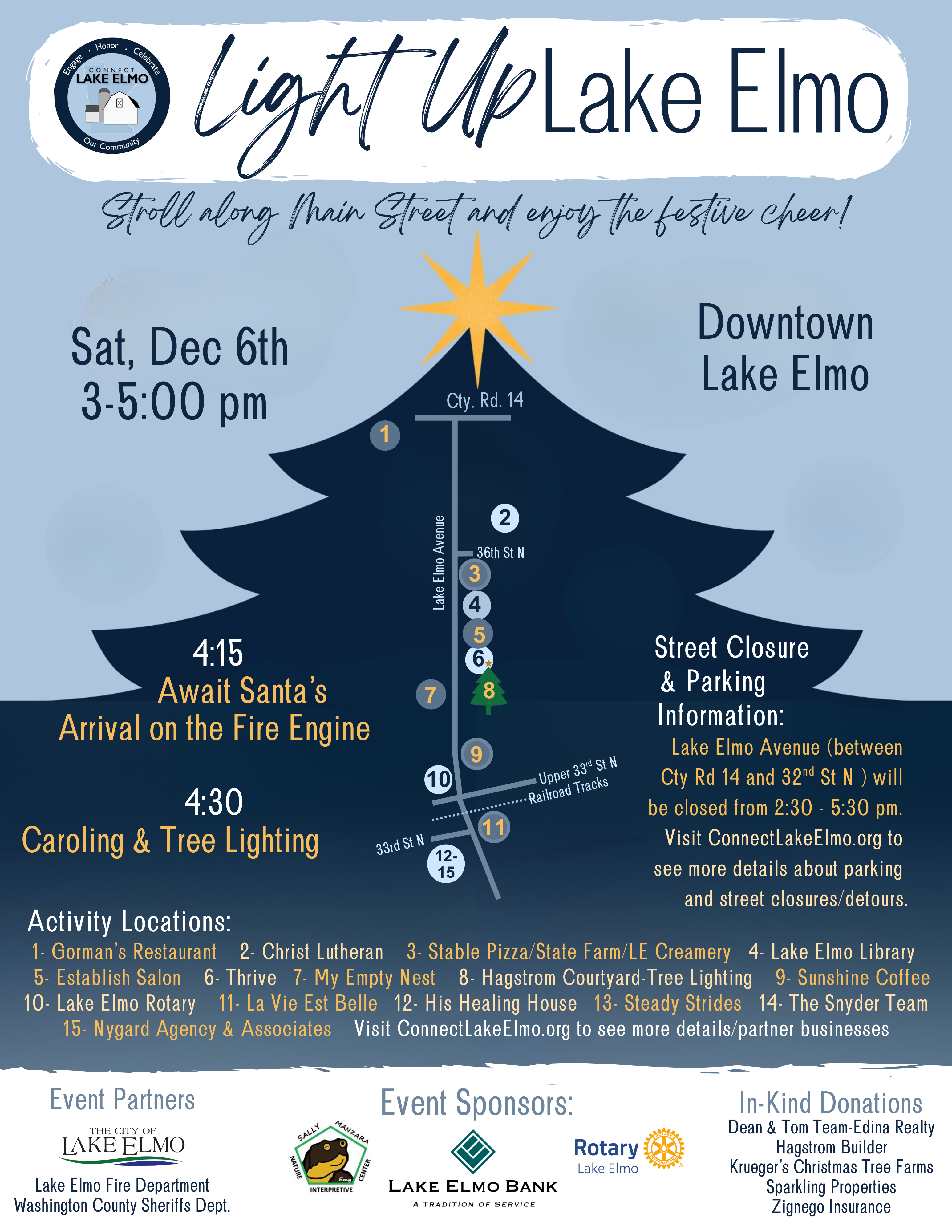 We will watch the weather closely and communicate updates beginning as early as the afternoon of December 5th. Any and all updates will be communicated via the Connect Lake Elmo Facebook page and this website. We will also work with the City of Lake Elmo and partner agencies to spread the word about any updates to the event. In the event of extreme weather (below zero and/or 6+ inches of snow within a few hours of the event), the event will be cancelled for safety reasons.